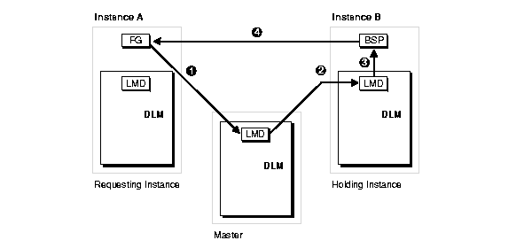 Foreground processes are the processes associated with user sessions. One instance communicates lock requests directly to remote LMD processes in other instances. Foreground processes send request information such as the resource name it is requesting a lock for and the mode in which it needs the lock. The Distributed Lock Manager processes the request asynchronously, so the foreground process waits for the request to complete before closing the request.