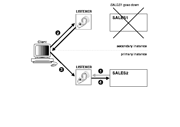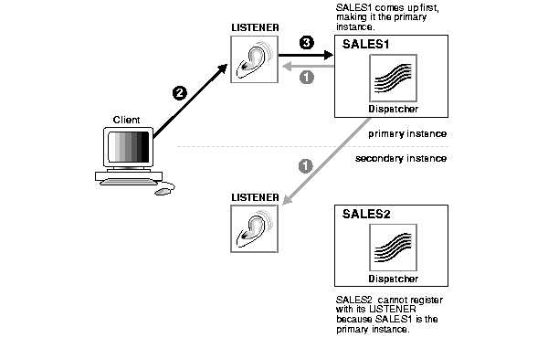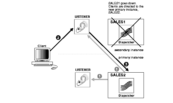 In Figure 9-4, if the primary node fails, the dispatcher in the secondary instance register with the listener as shown in Step 1. When the client requests a reconnection to the database through either of the listeners, the listener directs the request to the secondary instance's dispatcher.