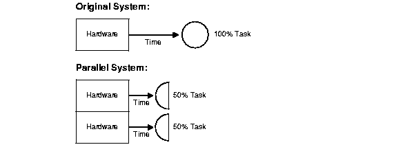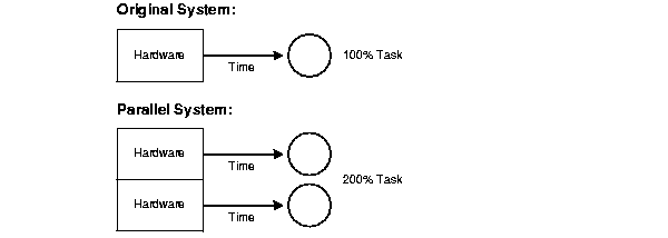 Speed-up is the extent to which more hardware can perform the same task in less time than the original system. With added hardware, speed-up holds the task constant and measures time savings. Figure 8-2 shows how each parallel hardware system performs half of the original task in half the time required to perform it on a single system.