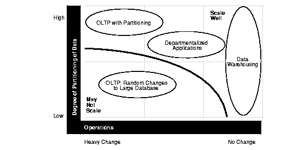 Figure 8-3 illustrates the relative scalability of different application types. Data warehousing applications, depicted by the left-most bubble, typically scale well since updates are less common and the degree of partitioning is higher than other application types. OLTP and departmentalized applications with partitioning and increasing rates of change also scale well.