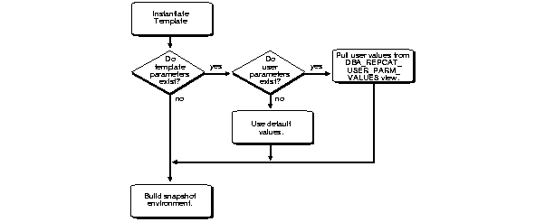 If user parameter values have been defined and a listed user is instantiating the template, the user parameter values are used when instantiating the template. If no user parameter values have been defined, Oracle uses the default parameter values. Figure 4-5 shows the parameter checking process.