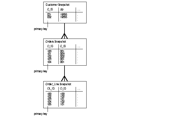 The subqueries in these snapshot examples walk up the many-to-one references from the child to the parent tables. The snapshots are populated with data that satisfies the defining query for each of these snapshots, and are refreshed only with data that satisfies these defining queries.