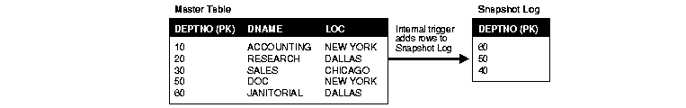 As described in the previous section, the internal trigger adds change information to the snapshot log whenever a DML transaction has taken place on the target master table.