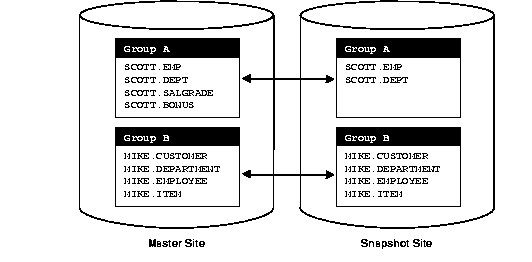 Group A at the snapshot site (see Figure 3-7) contains only some of the objects in the corresponding Group A at the master site. Group B at the snapshot site contains all objects in Group B at the master site. Under no circumstances, however, could Group B at the snapshot site contain objects from Group A at the master site. As illustrated in Figure 3-7, a snapshot group has the same name as the master group on which the snapshot group is based. For example, a snapshot group based on a "PERSONNEL" master group is also named "PERSONNEL."