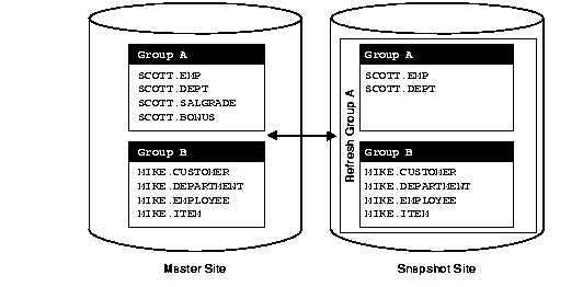 In addition to the snapshot mechanisms described in the previous section, there are several other mechanisms that organize the snapshots at the snapshot site. These mechanisms maintain organizational consistency between the snapshot site and the master site as well as transactional (read) consistency with the target master group. These mechanisms are snapshot groups and refresh groups.