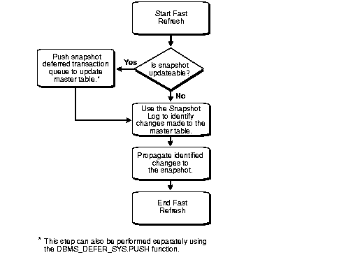 To perform a fast refresh, the server that manages the snapshot first identifies the changes that occurred in the master since the most recent refresh of the snapshot and then applies them to the snapshot. Fast refreshes are more efficient than complete refreshes when there are few changes to the master because the participating server and network replicate a smaller amount of data. You can perform fast refreshes of snapshots only when the master table has a snapshot log.
