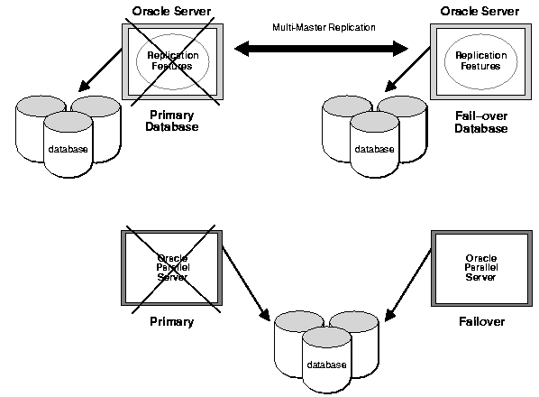 The Oracle Parallel Server does not, however, provide survivability for site failures (such as flood, fire, or sabotage) that render an entire site, and thus the entire cluster or massively parallel system, inoperable. To provide survivability for site failures, you can use the replication facility to maintain a replica of a database at a geographically remote location.