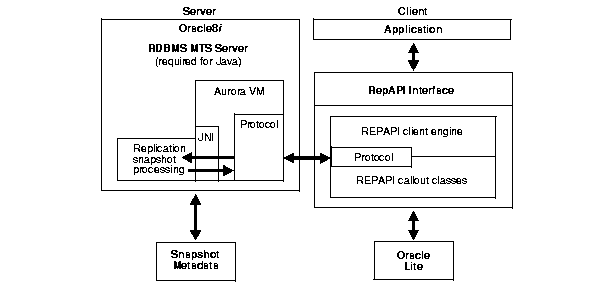 In past releases, RepAPI was written in the C programming language, but it has been completely rewritten in Java for Oracle8i. This Java-based RepAPI facility requires fewer resources and is easier to use than its C-language predecessor. Also, in Oracle8i, round-trip network communication between the client and the server is kept to a minimum by reducing the amount of metadata maintained on the client and by keeping the SQL snapshot queries entirely on the master side.