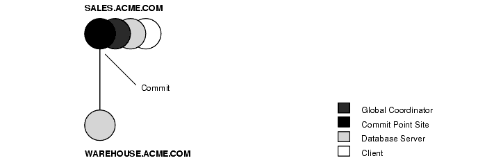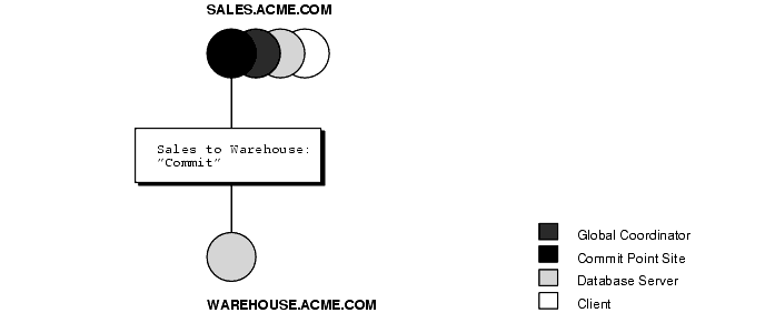 In Figure 4-10, SALES.ACME.COM, which is both the commit point site and the global coordinator, has already committed the transaction locally. SALES now instructs WAREHOUSE.ACME.COM to commit the transaction.