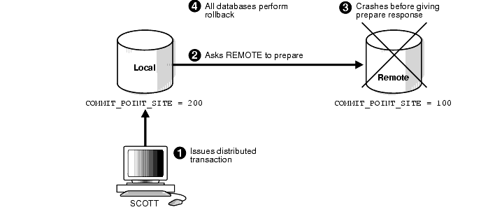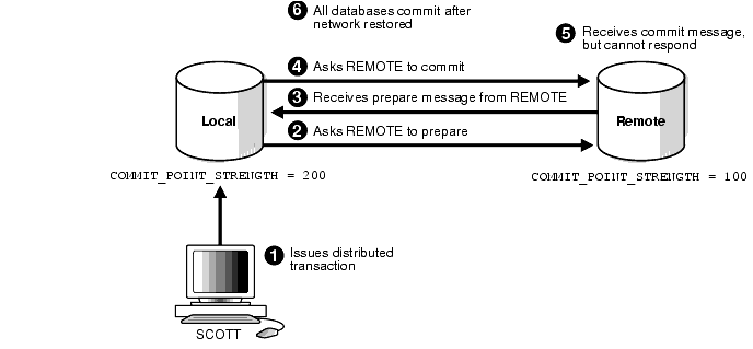 In the majority of cases, Oracle resolves the in-doubt transaction automatically. Assume that there are two nodes, LOCAL and REMOTE, in the following scenarios. The local node is the commit point site. User SCOTT connects to LOCAL and executes and commits a distributed transaction that updates LOCAL and REMOTE.