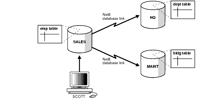 The following distributed transaction executed by SCOTT updates the local SALES database, the remote HQ database, and the remote MAINT database: