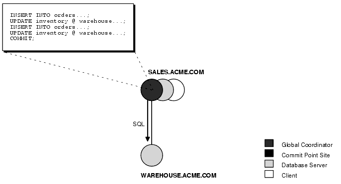 CONNECT scott/tiger@sales.acme.com ...; INSERT INTO orders ...; UPDATE inventory@warehouse.acme.com ...; INSERT INTO orders ...; UPDATE inventory@warehouse.acme.com ...; COMMIT;
