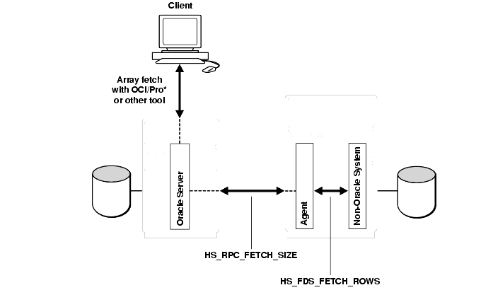 The initialization parameter HS_FDS_FETCH_ROWS determines the number of rows to be retrieved from a non-Oracle system. Note that the array fetch must be supported by the agent. See your agent-specific documentation to ensure that your agent supports array fetching.