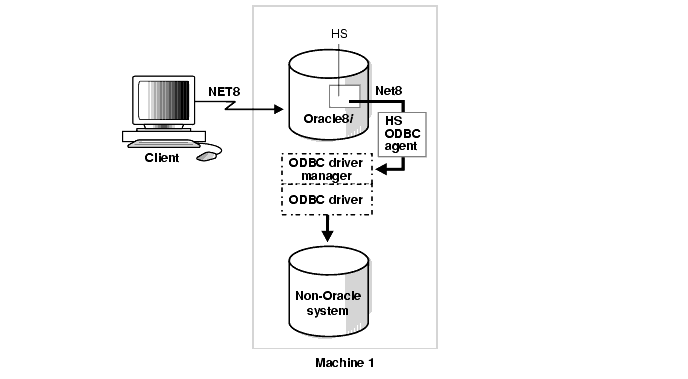 Figure 8-1 shows an example of one configuration in which an Oracle and non-Oracle database are on separate machines, communicating through an HS ODBC agent: