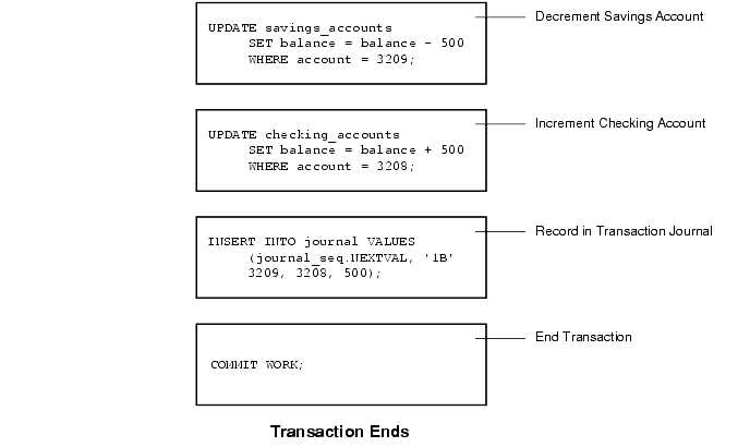 For example, recall the banking example. A transfer of funds between two accounts (the transaction) should include increasing one account (one SQL statement), decreasing another account (one SQL statement), and the record in the transaction journal (one SQL statement). All actions should either fail or succeed together; the credit should not be committed without the debit. Other non-related actions, such as a new deposit to one account, should not be included in the transfer of funds transaction; such statements should be in other transactions.