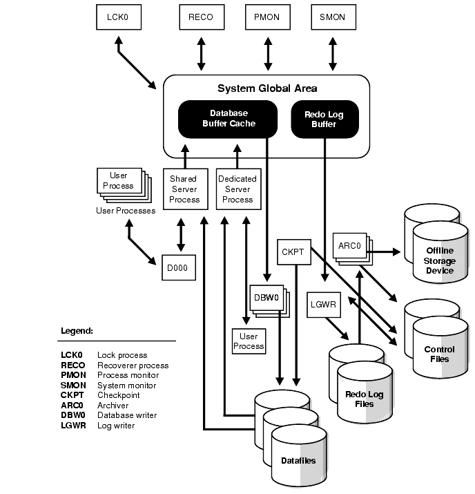 Figure 1-2 shows a typical variation of the Oracle server memory and process structures.