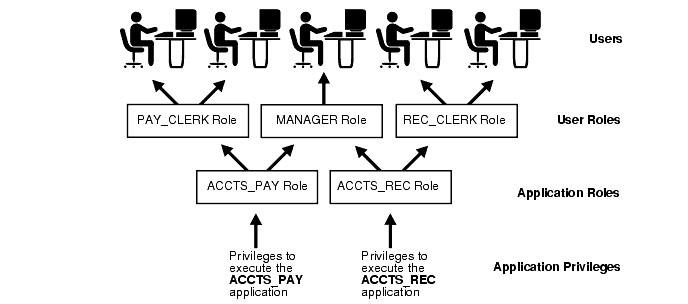 Database administrators often create roles for a database application. The DBA grants an application role all privileges necessary to run the application. The DBA then grants the application role to other roles or users. An application can have several different roles, each granted a different set of privileges that allow for more or less data access while using the application.
