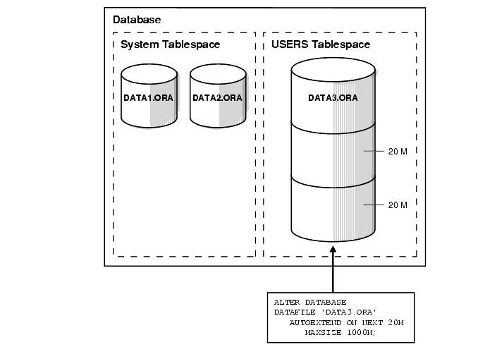 When you add another datafile to an existing tablespace, you increase the amount of disk space allocated for the corresponding tablespace. Figure 3-2 illustrates this kind of space increase.