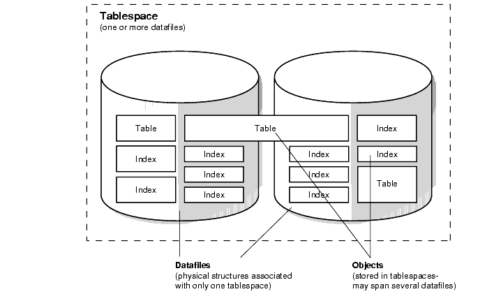 The data associated with schema objects in a tablespace is physically stored in one or more of the datafiles that constitute the tablespace. Note that a schema object does not correspond to a specific datafile; rather, a datafile is a repository for the data of any schema object within a specific tablespace. Oracle allocates space for the data associated with a schema object in one or more datafiles of a tablespace. Therefore, a schema object can span one or more datafiles. Unless table striping is used (where data is spread across more than one disk), the database administrator and end users cannot control which datafile stores a schema object.