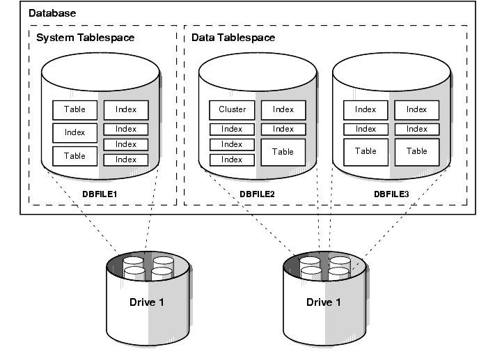 Figure 10-1 illustrates the relationship among objects, tablespaces, and datafiles.