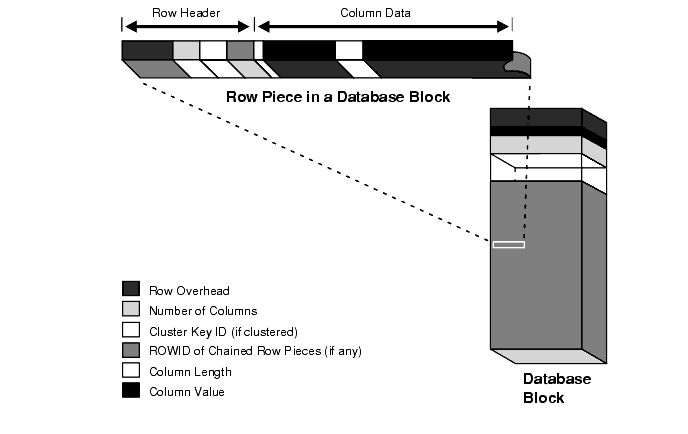 Oracle stores each row of a database table as one or more row pieces. If an entire row can be inserted into a single data block, then Oracle stores the row as one row piece. However, if all of a row's data cannot be inserted into a single data block or an update to an existing row causes the row to outgrow its data block, Oracle stores the row using multiple row pieces. A data block usually contains only one row piece per row. When Oracle must store a row in more than one row piece, it is chained across multiple blocks. A chained row's pieces are chained together using the rowids of the pieces.