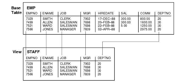 For example, Figure 10-5 shows how the STAFF view does not show the SAL or COMM columns of the base table EMP.