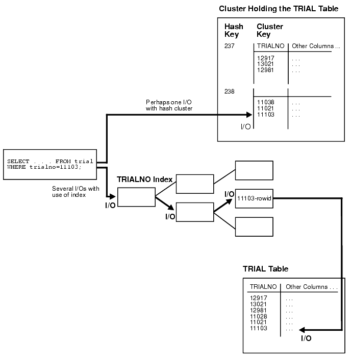 Figure 10-10 illustrates data retrieval for a table in a hash cluster as well as a table with an index. The following sections further explain the internal operations of hash cluster storage.