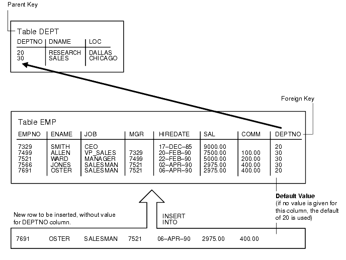 Integrity constraint checking occurs after the row with a default value is inserted. For example, in Figure 10-4, a row is inserted into the EMP table that does not include a value for the employee's department number. Because no value is supplied for the department number, Oracle inserts the DEPTNO column's default value of 20. After inserting the default value, Oracle checks the FOREIGN KEY integrity constraint defined on the DEPTNO column.