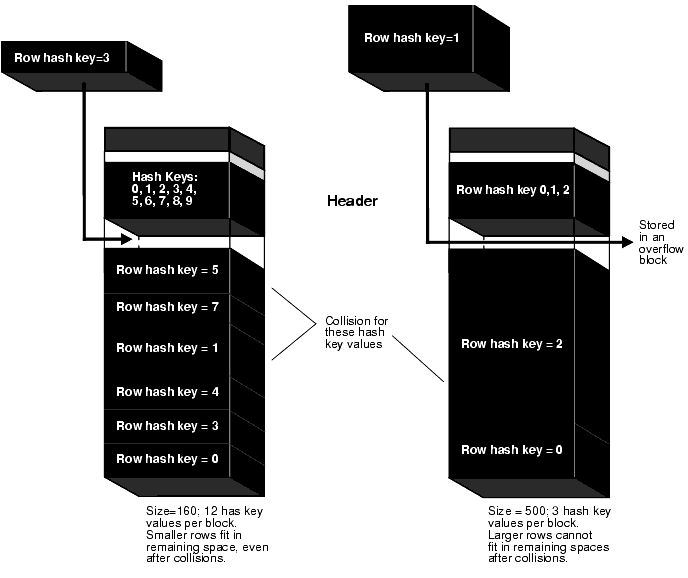 If the average size is small and each row has a unique hash key value, then many hash key values can be assigned per data block. In this case, a small colliding row can likely fit into the space of the root block for the hash key. However, if the average hash key value size is large or each hash key value corresponds to multiple rows, then only a few hash key values can be assigned per data block. In this case, it is likely that the large row will not fit in the root block allocated for the hash key value and an overflow block is allocated.