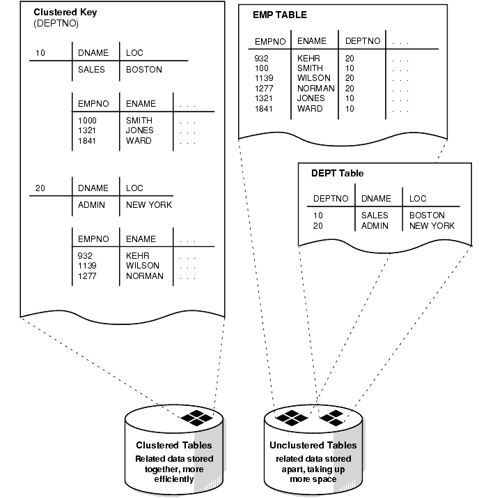For example, the EMP and DEPT table share the DEPTNO column. When you cluster the EMP and DEPT tables, Oracle physically stores all rows for each department from both the EMP and DEPT tables in the same data blocks.