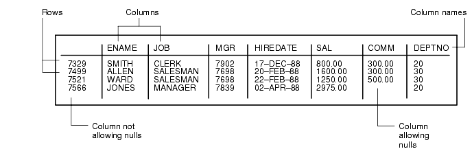 Tables are the basic unit of data storage in an Oracle database. Data is stored in rows and columns. You define a table with a table name (such as EMP) and set of columns. You give each column a column name (such as EMPNO, ENAME, and JOB), a datatype (such as VARCHAR2, DATE, or NUMBER), and a width. The width might be predetermined by the datatype, as in DATE. If columns are of the NUMBER datatype, define precision and scale instead of width. A row is a collection of column information corresponding to a single record.