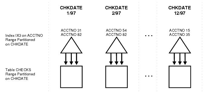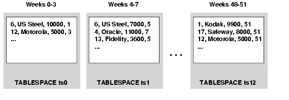 CREATE TABLE sales ( acct_no NUMBER(5), acct_name CHAR(30), amount_of_sale NUMBER(6), week_no INTEGER ) PARTITION BY RANGE ( week_no ) ... (PARTITION sales1 VALUES LESS THAN ( 4 ) TABLESPACE ts0, PARTITION sales2 VALUES LESS THAN ( 8 ) TABLESPACE ts1, ... PARTITION sales13 VALUES LESS THAN ( 52 ) TABLESPACE ts12 );