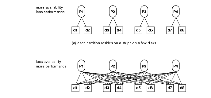 Intermediate configurations are also possible, where subsets of partitions are striped over subsets of disks.