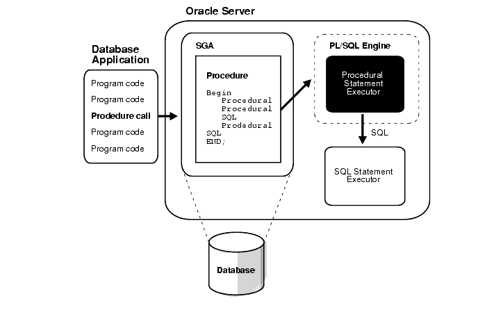 The procedure (or package) is stored in a database. When an application calls a procedure stored in the database, Oracle loads the compiled procedure (or package) into the shared pool in the system global area (SGA), and the PL/SQL and SQL statement executors work together to process the statements within the procedure.