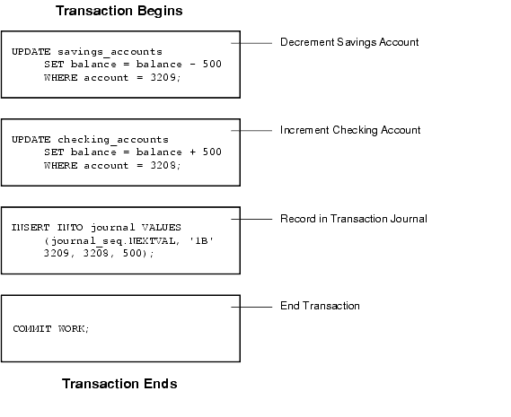 Oracle must allow for two situations. If all three SQL statements can be performed to maintain the accounts in proper balance, the effects of the transaction can be applied to the database. However, if a problem such as insufficient funds, invalid account number, or a hardware failure prevents one or two of the statements in the transaction from completing, the entire transaction must be rolled back so that the balance of all accounts is correct.