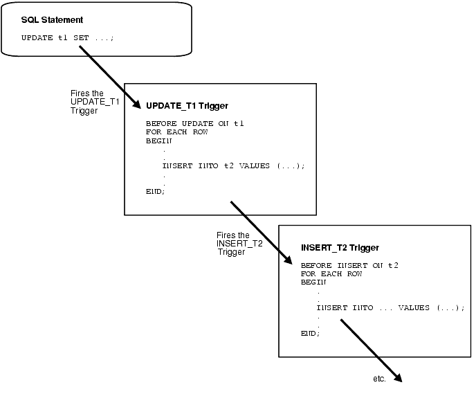 Although triggers are useful for customizing a database, use them only when necessary. Excessive use of triggers can result in complex interdependencies, which may be difficult to maintain in a large application. For example, when a trigger fires, a SQL statement within its trigger action potentially can fire other triggers, resulting in cascading triggers. This can produce unintended effects. Figure 19-2 illustrates cascading triggers.