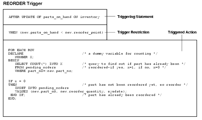 Figure 19-3 represents each of these parts of a trigger and is not meant to show exact syntax. The sections that follow explain each part of a trigger in greater detail.