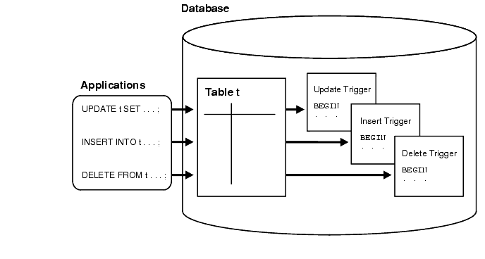 Figure 19-1 shows a database application with some SQL statements that implicitly fire several triggers stored in the database. Notice that the database stores triggers separately from their associated tables.