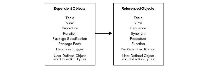 Some types of schema objects can reference other objects as part of their definition. For example, a view is defined by a query that references tables or other views. A procedure's body can include SQL statements that reference other objects of a database. An object that references another object as part of its definition is called a dependent object, while the object being referenced is a referenced object. Figure 20-1 illustrates the different types of dependent and referenced objects: