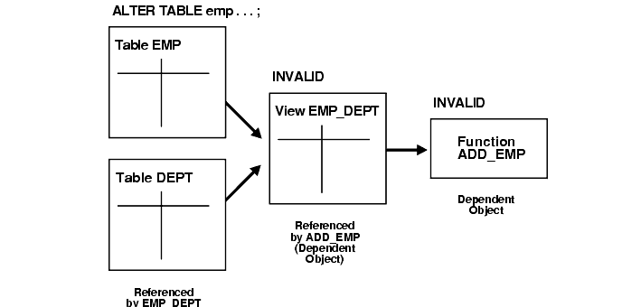 For example, assume a stored procedure UPDATE_SAL references the table JWARD.EMP. If the definition of the table is altered in any way, the status of every object that references JWARD.EMP is changed to INVALID, including the stored procedure UPDATE_SAL. As a result, the procedure cannot be executed until it has been recompiled and is valid. Similarly, when a DML privilege is revoked from a user, every dependent object in the user's schema is invalidated. However, an object that is invalid because authorization was revoked can be revalidated by "reauthorization", in which case it does not require full recompilation.