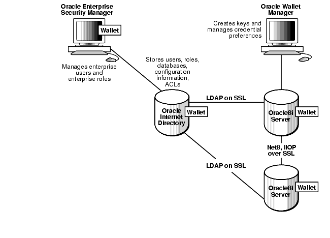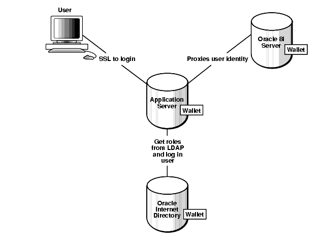 The Secure Socket Layer (SSL) protocol is an application layer protocol. It can be used for user authentication to a database, independent of global user management in Oracle Internet Directory. That is, users may use SSL to authenticate to the database without implying anything about their directory access. However, if you wish to use the enterprise user functionality to manage users and their privileges in a directory, the user must use SSL to authenticate to the database. A parameter in the initialization file governs which use of SSL is expected.