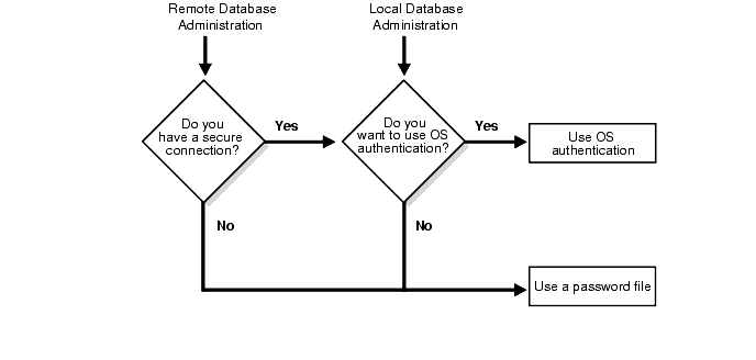 Figure 26-3 illustrates the choices you have for database administrator authentication schemes, depending on whether you administer your database locally (on the same machine on which the database resides) or if you administer many different database machines from a single remote client.