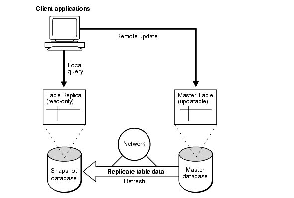In a basic configuration, snapshots can provide read-only access to the table data that originates from a master site. Applications can query data from read-only snapshots to avoid network access regardless of network availability. However, applications throughout the system must access data at the master site to perform an update. Figure 31-2 illustrates basic, read-only replication. The master tables of read-only snapshots do not need to belong to a master group.