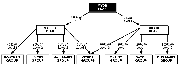 If the MYDB resource plan were in effect and there were an infinite number of runnable users in all resource consumer groups, the MAILDB plan would be in effect 30% of the time, while the BUGDB plan would be in effect 70% of the time.