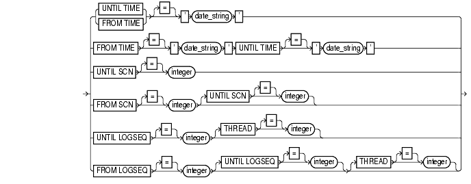 specifies the end date for a sequence of archived redo log files. The time specified in the string must be formatted according to the NLS date format specification currently in effect. If you do not specify the from time parameter, the beginning time for the sequence will be the earliest available archived redo log. Query the V$ARCHIVED_LOG data dictionary view to determine the timestamps for the first and last entries in a log. See Also: Oracle8i Reference for information on using the NLS_LANG and NLS_DATE_FORMAT environment variables to specify the format for the time. |