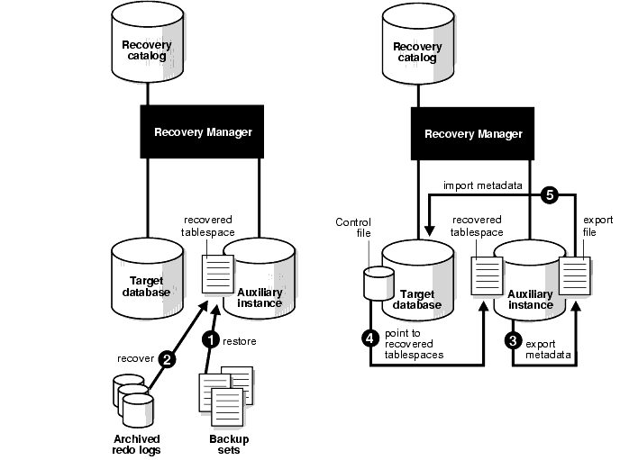 Recovery Manager restores and recovers all datafiles belonging to the tablespaces in the recovery set and auxiliary set at the auxiliary instance. Note that the auxiliary set includes the SYSTEM tablespace plus all the tablespaces with rollback segments.