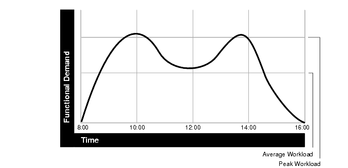 Workload is an important factor when evaluating your system's level of CPU utilization. During peak workload hours, 90% CPU utilization with 10% idle and waiting time may be acceptable. Even 30% utilization at a time of low workload may be understandable. However, if your system shows high utilization at normal workload, then there is no room for a peak workload. For example, Figure 18-1 illustrates workload over time for an application having peak periods at 10:00 AM and 2:00 PM.