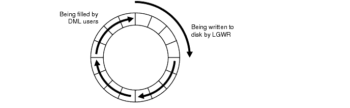 When LGWR writes redo entries from the redo log buffer to a redo log file or disk, user processes can then copy new entries over the entries in memory that have been written to disk. LGWR normally writes fast enough to ensure that space is always available in the buffer for new entries, even when access to the redo log is heavy.