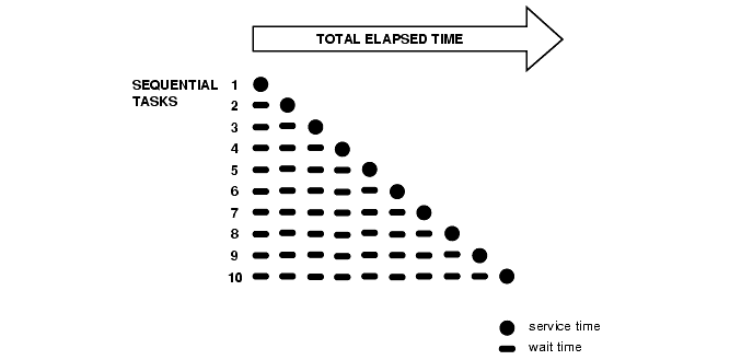 In this example, only task 1 runs without having to wait. Task 2 must wait until task 1 has completed; task 3 must wait until tasks 1 and 2 have completed, and so on. (Although the figure shows the independent tasks as the same size, the size of the tasks vary.)