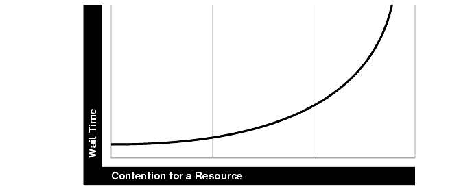 The service time for a task may stay the same, but wait time increases as contention increases. If many users are waiting for a service that takes 1 second, then the tenth user must wait 9 seconds for a service that takes 1 second.